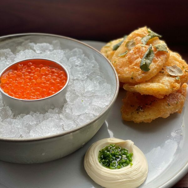 Enjoy 30g Yarra Valley Caviar, served with saltbush potato fritters, creme fraiche & chives, paired with 2 x glasses of Chandon